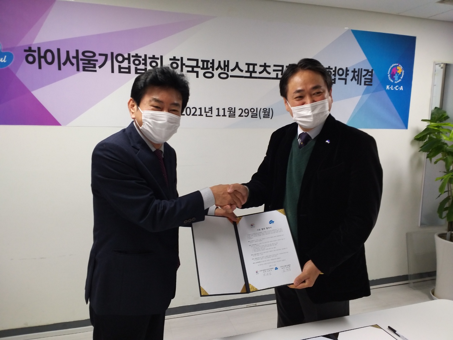 2021년 11월 29일(월)11시 하이서울기업협회에서 한국평생스포츠코칭협회(KCLA, 회장 양원석)와 하이서울기업협회(회장 조현종)가상호 신뢰와 협력을 바탕으로 양측의 사업 분야에 있어 발전 및 교류 활성화를 위한 협약을 체결하였다.양 기관은 건깅증진 및 복지 향상을 위한 프로그램 개발과 지원, KLCA 지도자 과정 운영에 상호 협력 및 회원사 홍보 지원에 합의 하였습니다